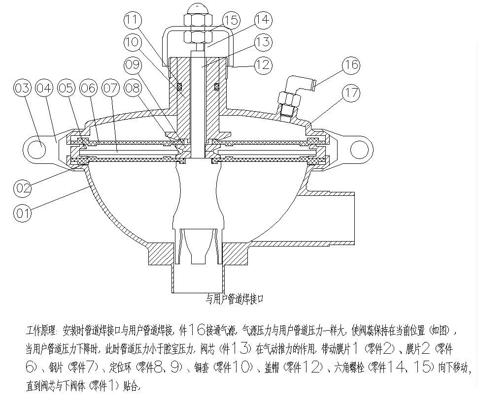 流體衛(wèi)生級(jí)恒壓閥工作原理:安裝時(shí)管道焊接口與用戶管道焊接,件16接通氣源,氣源壓力與用戶管道壓力一樣大,使閥蕊保持在當(dāng)前位置(如圖),當(dāng)用戶管道壓力下降時(shí),此時(shí)管道壓力小于腔室壓力,閥芯(件13)在氣動(dòng)推力的作用,帶動(dòng)膜片1(零件2)、膜片2(零件6)、鋼片(零件7)、定位環(huán)(零件8、9)、銅套(零件10)、蓋帽(零件12)、六角螺栓(零件14、15)向下移動(dòng),直到閥芯與下閥體(零件1)貼合。